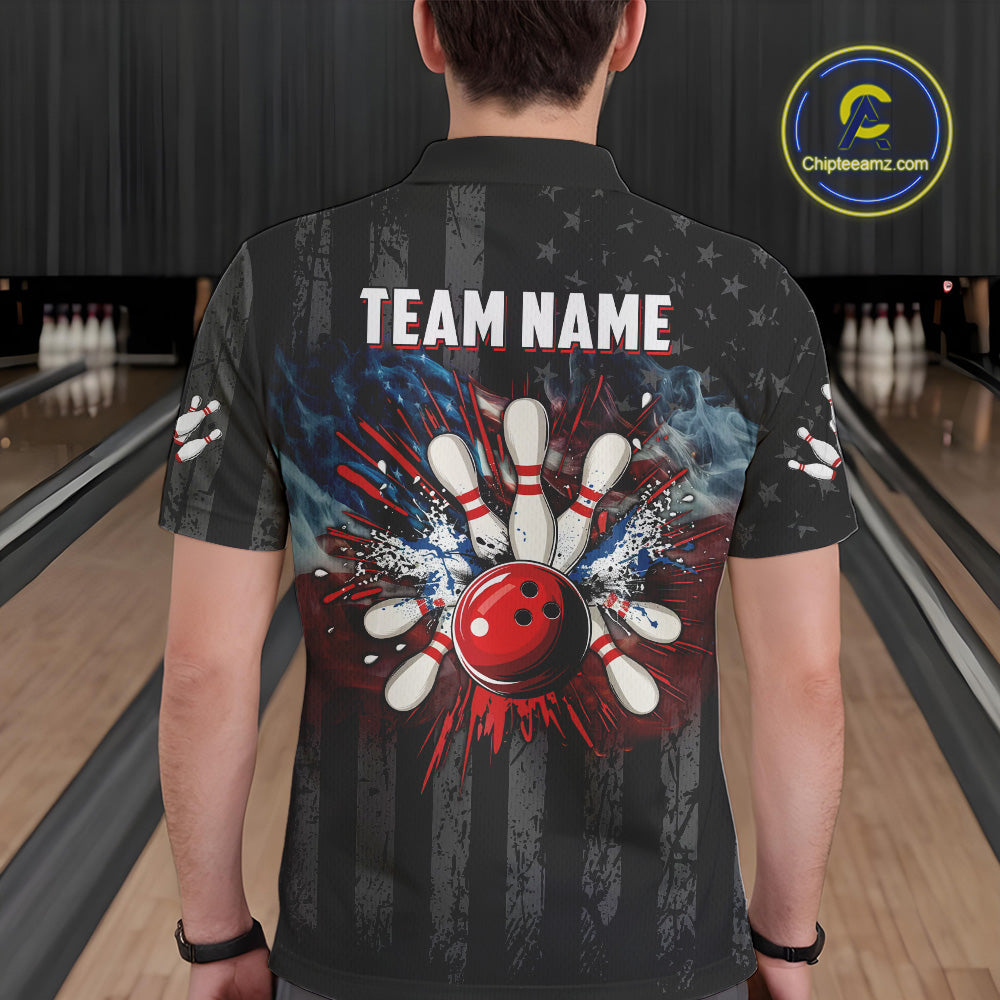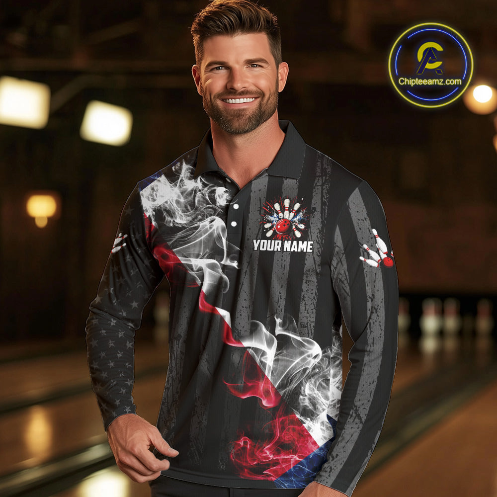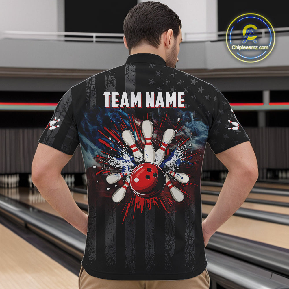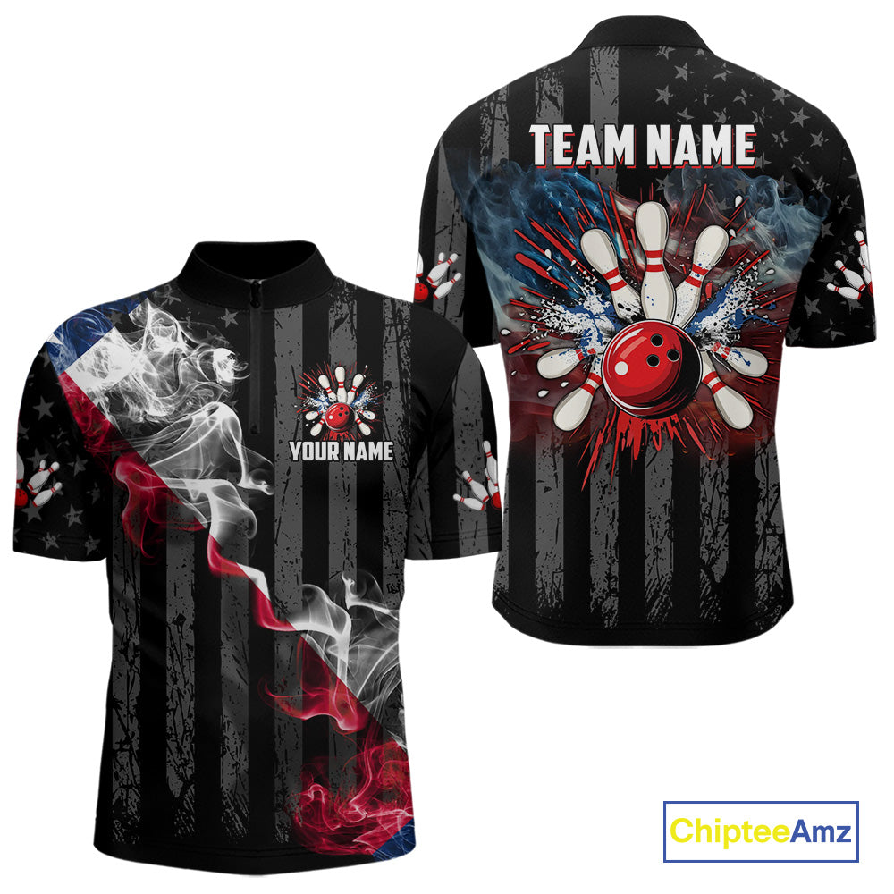 Black Texas flag smoke Men Bowling Polo, Quarter Zip shirt Custom Patriotic Team Bowling Jersey NQS10402