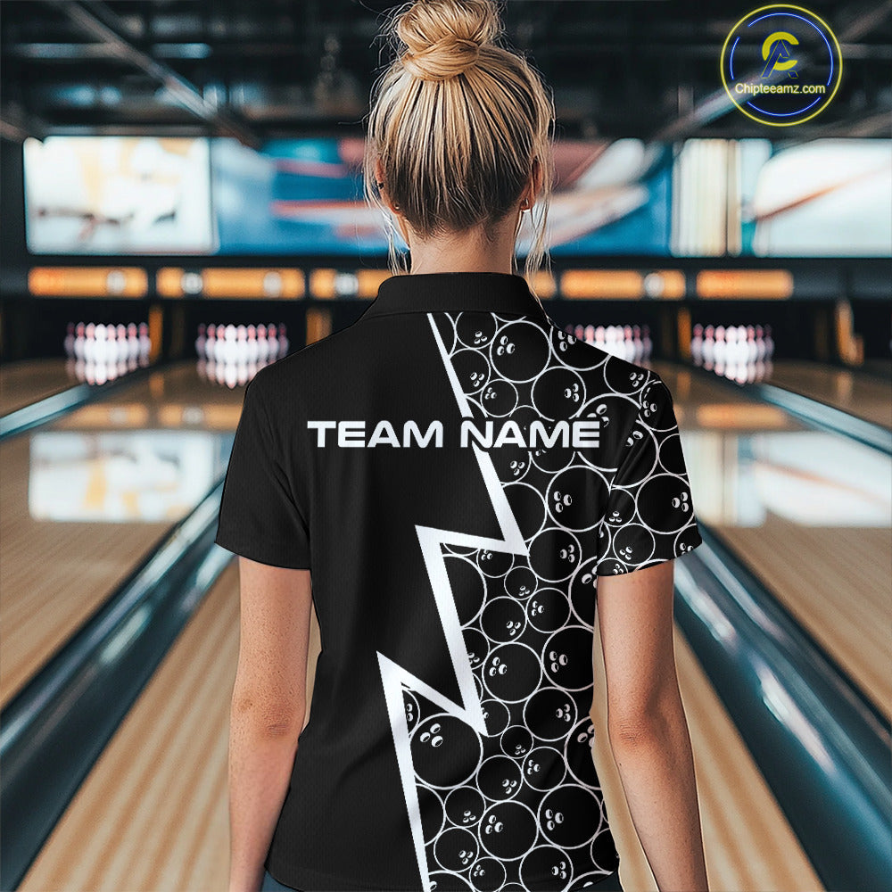 Black & White Lightning Camo Bowling Polo, Quarter Zip Shirt For Women Custom Team Bowling Jersey NQS10854