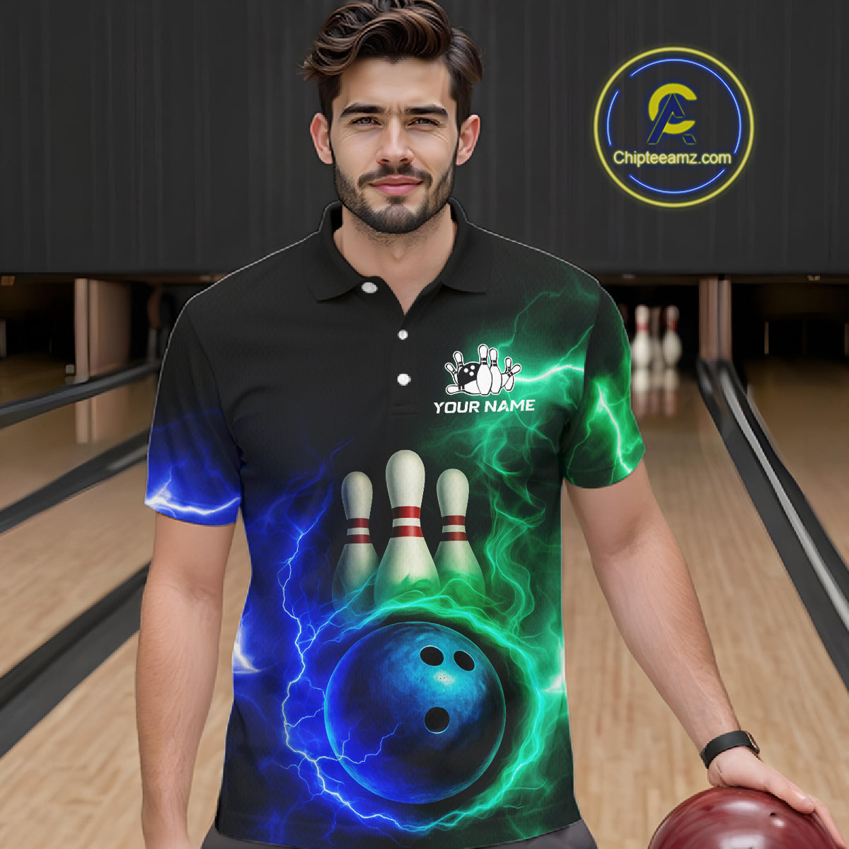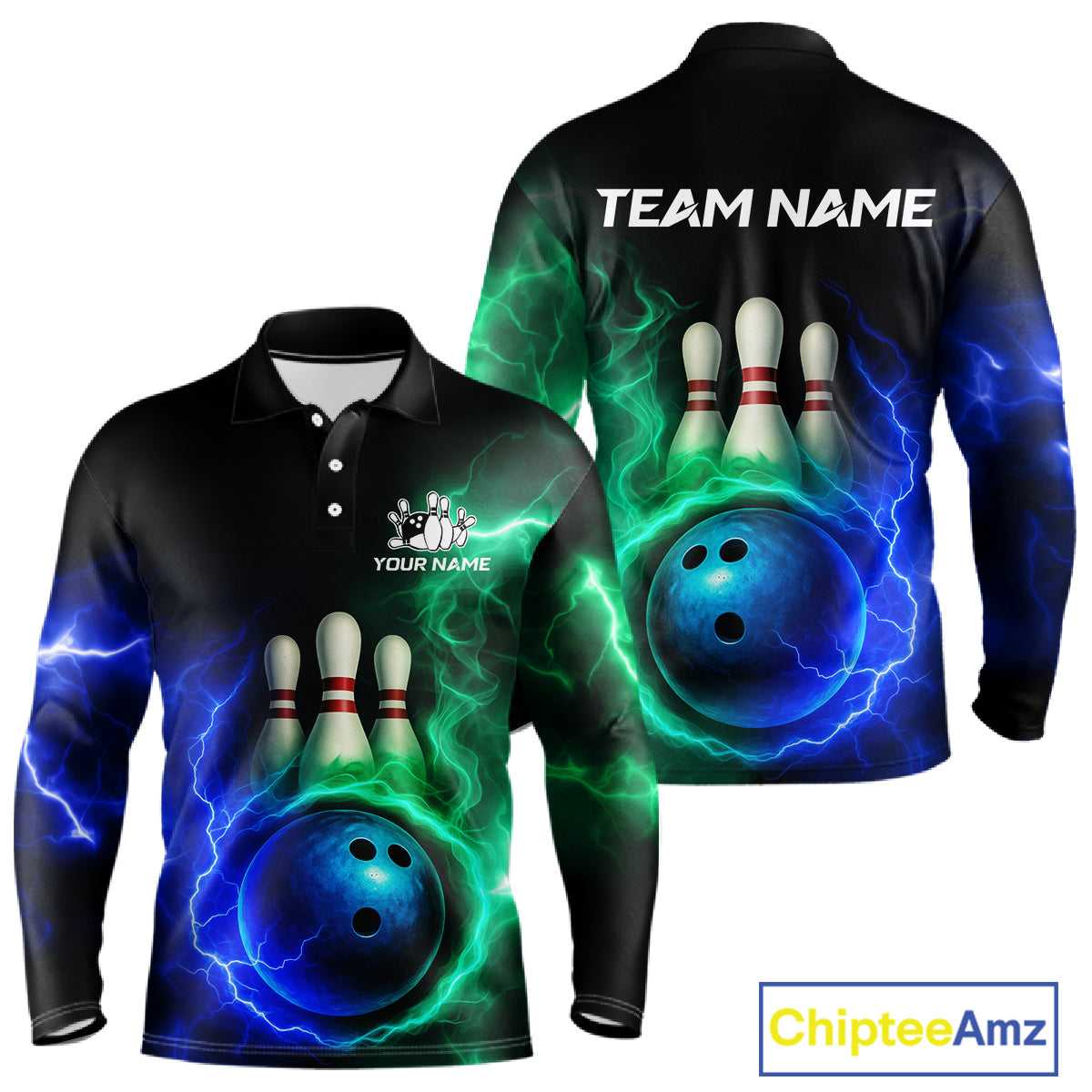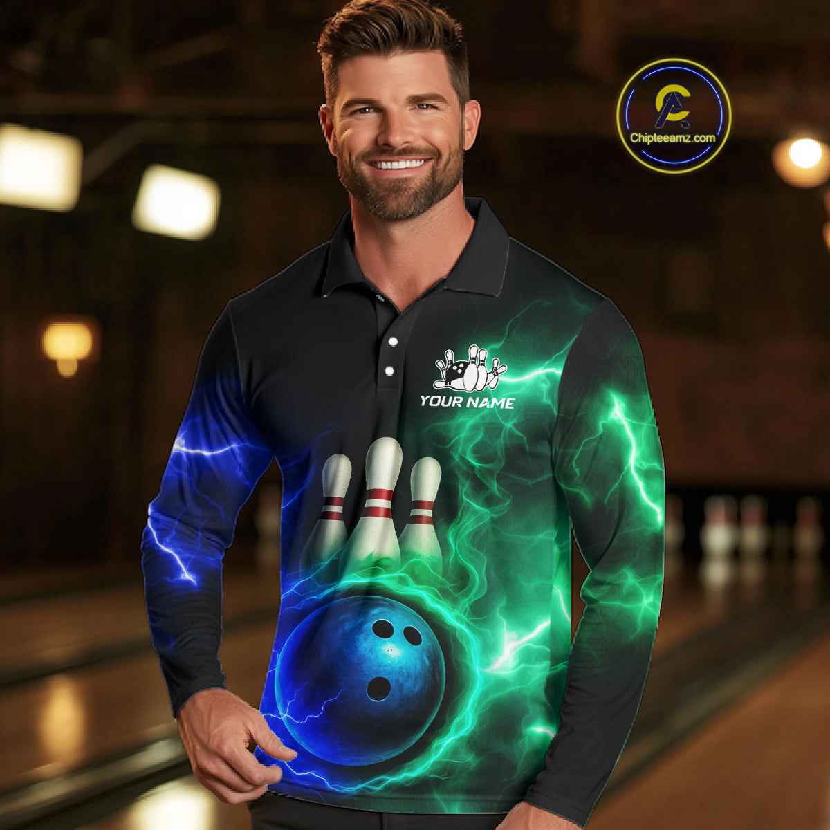 Blue and Green Lightning thunder Black Bowling Shirts For Men custom Bowling Team Jerseys NQS10379