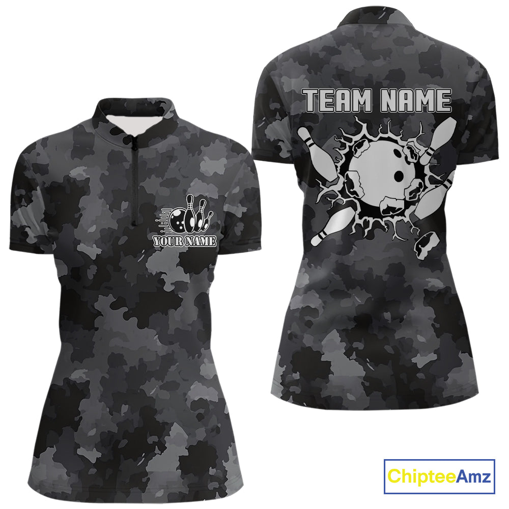 Bowling Polo, Quarter Zip shirts For Women Custom bowling ball & pins black camo Bowling Team Jersey NQS10889