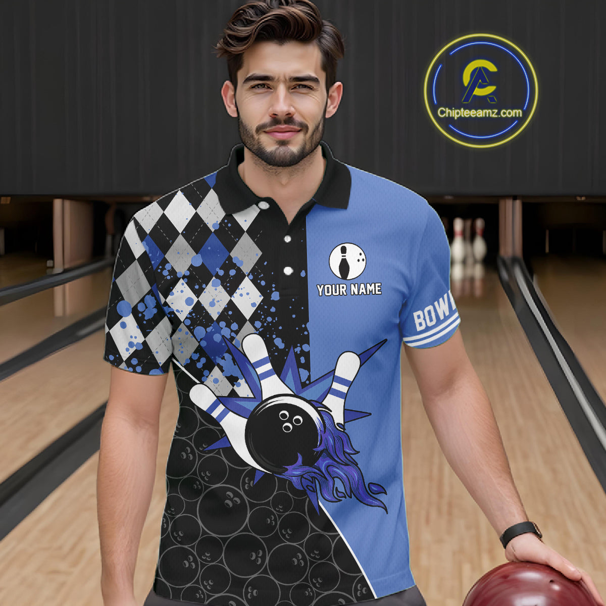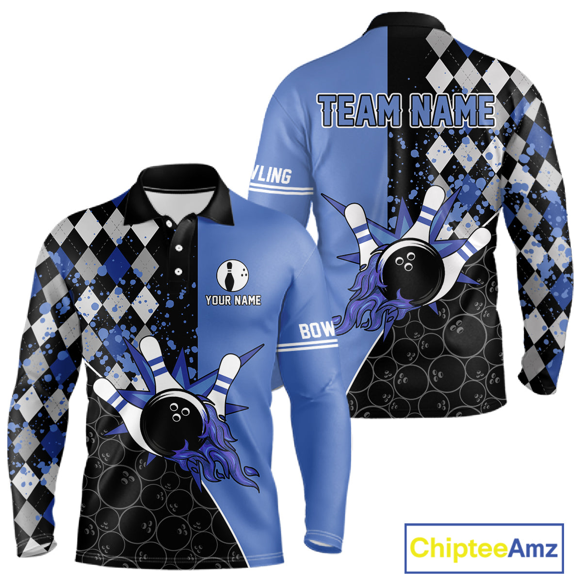 Custom Black and Blue argyle pattern flame Bowling Team Jerseys, Bowling Polo, 1/4 Zip Shirt for Men NQS10451