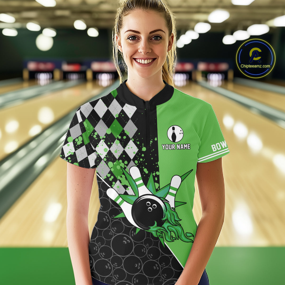 Custom Black and Green argyle pattern flame Bowling Team Jersey Bowling Polo, 1/4 Zip Shirt for Women NQS10450