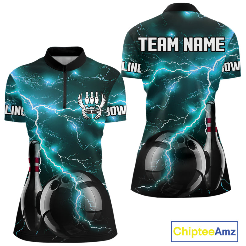 Cyan Blue Lightning Thunder Black Bowling Polo, 1/4 zip Shirt for Women custom bowling team jersey NQS10529