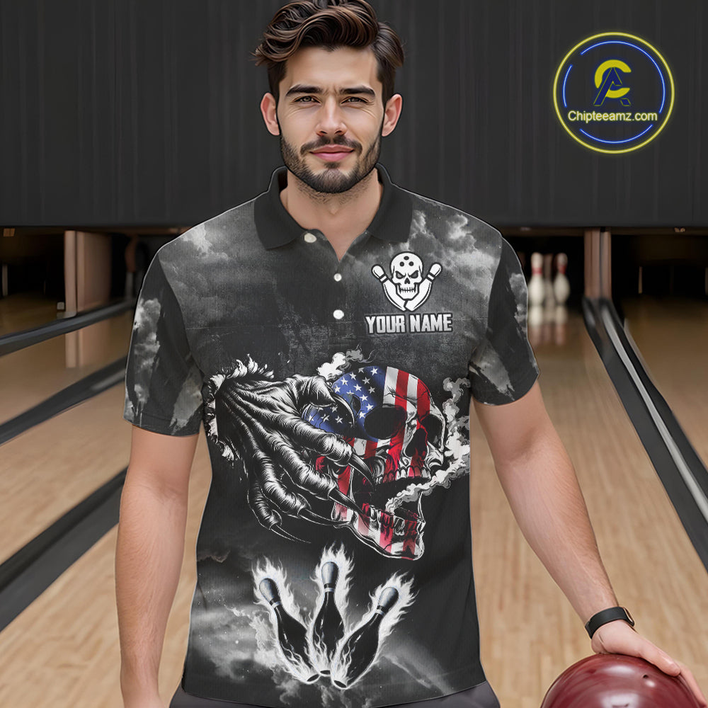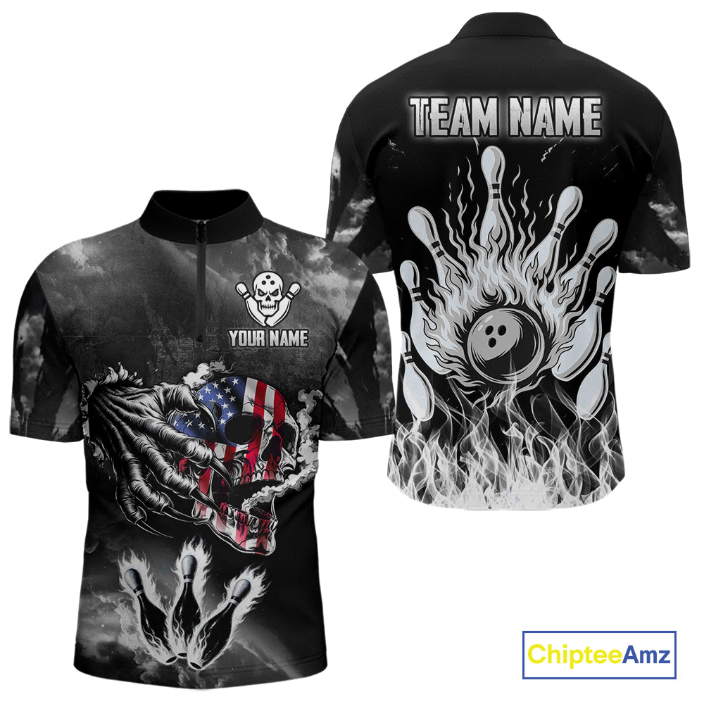 Black And White Flaming American Flag Skull Bowling Shirt For Men Custom Fire Bowling Team Jersey TDM4752