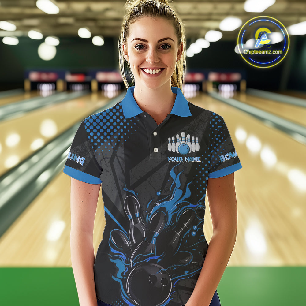 Personalized Black and Blue Flame Bowling Polo, 1/4 Zip Shirts For Women, Custom bowling Team Jerseys NQS10771