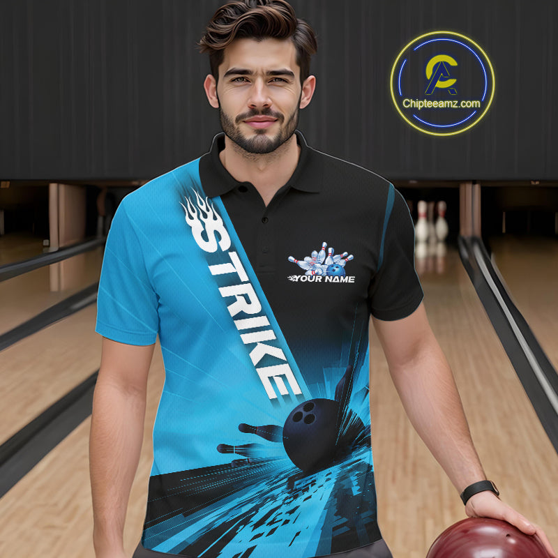 Custom Black And Blue Strike Bowling Polo Shirts For Men, Bowling Team Uniform IPHW9552