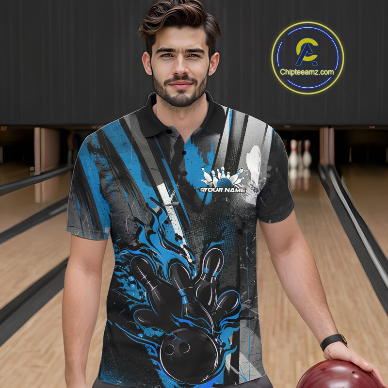 Custom Grunge Black And Blue Fire Flame Bowling Polo Shirts For Men, Bowling Team Uniform IPHW9556