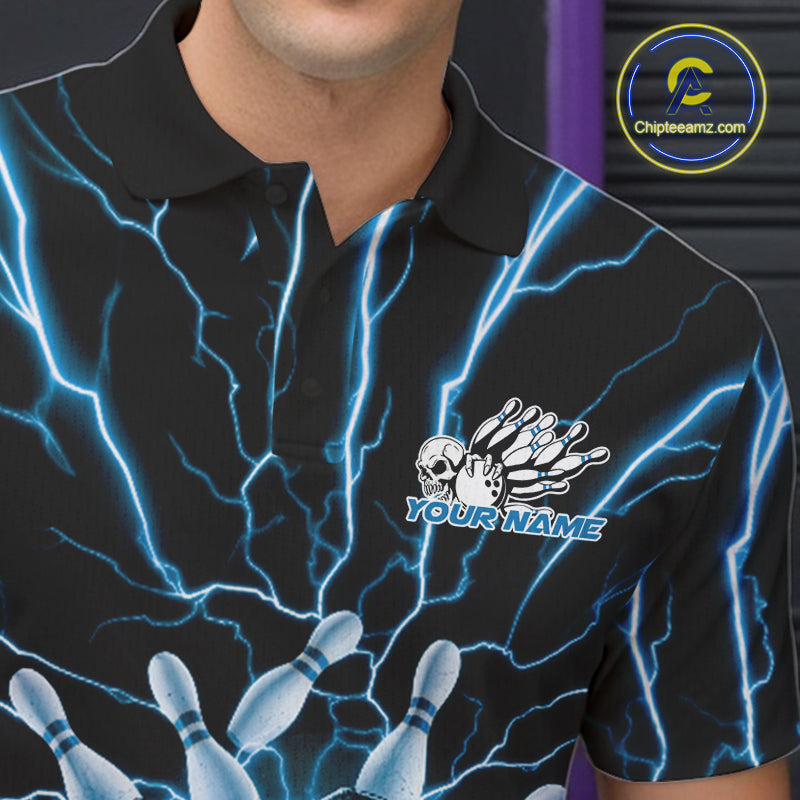 Custom Black And Blue Lightning Grim Reaper Bowling Men Polo Shirt, Halloween Outfit IPHW9804