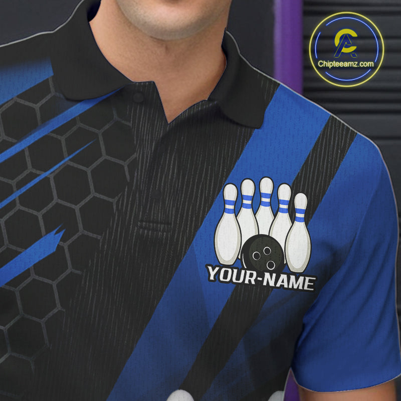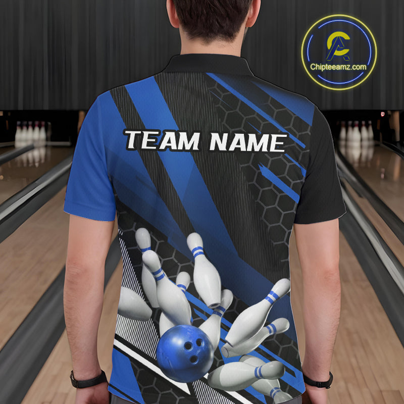 Custom Black And Blue Bowling Team Jerseys, Striking Bowling League Polo Shirt For Men IPHW9811