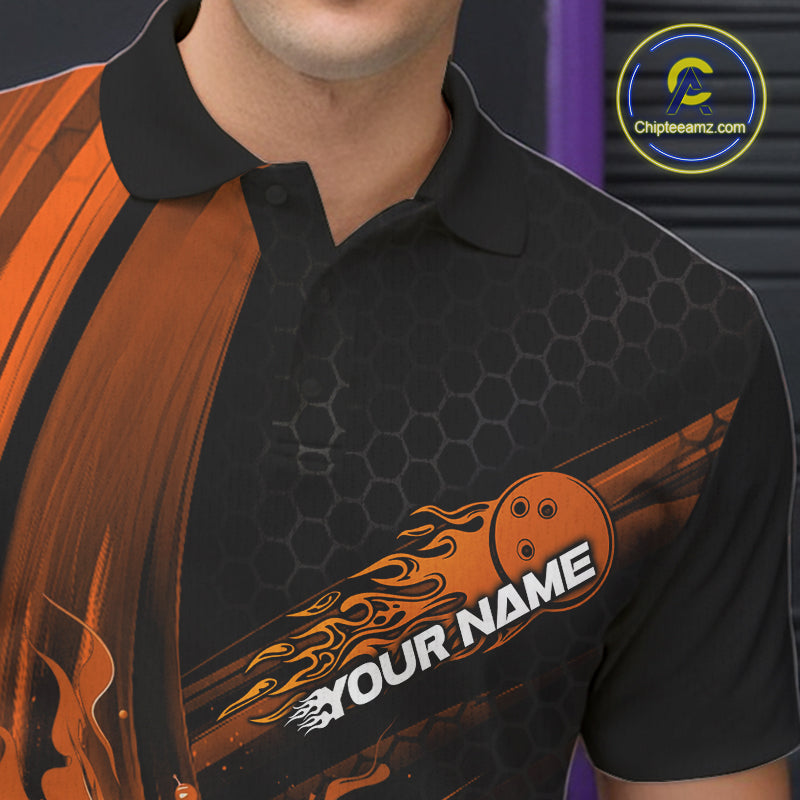 Custom Black And Orange Flame Bowling Jerseys, Bowling Team Polo Shirts For Men IPHW9887