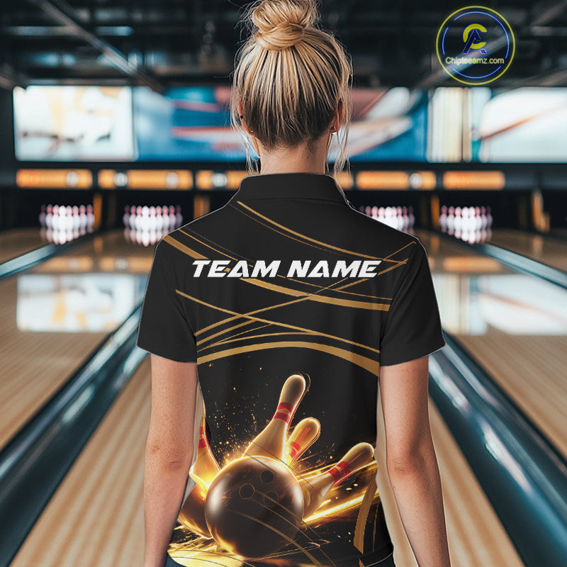 Custom Black And Gold Lane Glowing Bowling Ball And Pins Polo Team Shirts For Women IPHW9474