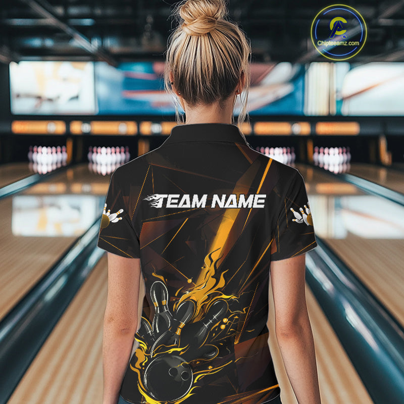Custom Black And Gold Flame Bowling Team Women Polo Shirts, Fire Bowling Jerseys IPHW9614