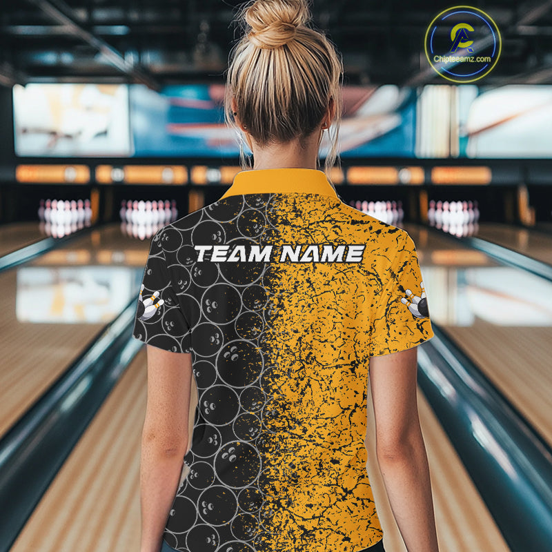 Custom Black And Yellow Splatter Bowling Ball Pattern Bowling Team Polo Shirts For Women IPHW9788
