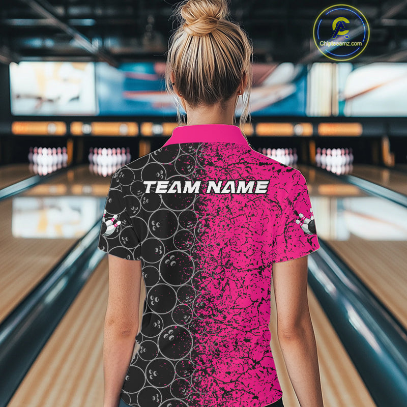 Custom Black And Pink Splatter Bowling Ball Pattern Bowling Team Polo Shirts For Women IPHW9789