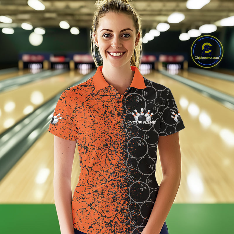 Custom Black And Orange Splatter Bowling Ball Pattern Bowling Team Polo Shirts For Women IPHW9791