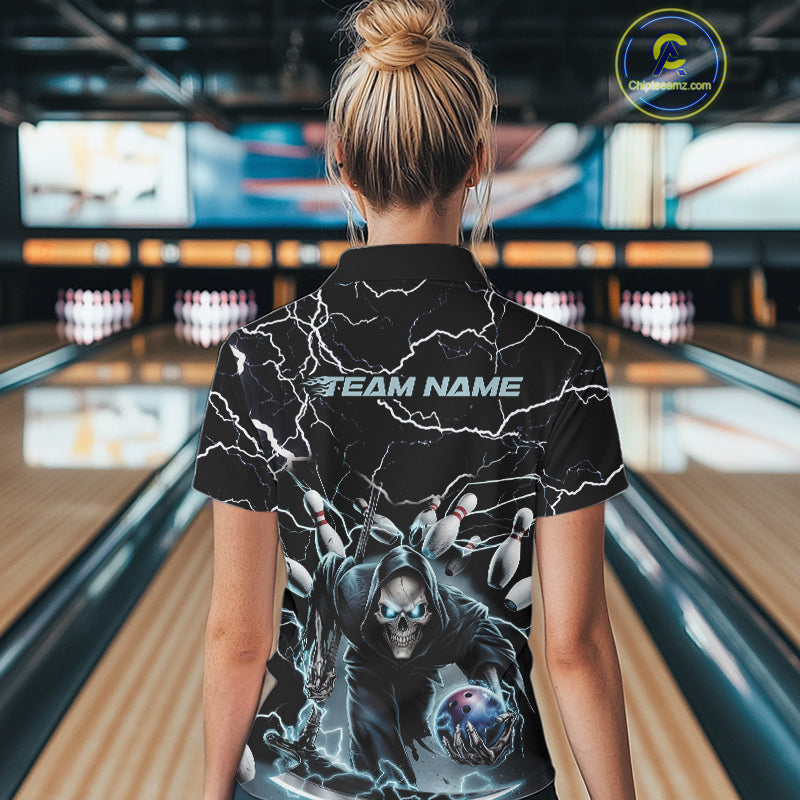 Custom Black And Blue Lightning Grim Reaper Bowling Women Polo Shirt, Halloween Outfit IPHW9801