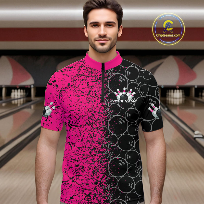 Custom Black And Pink Splatter Bowling Ball Pattern Bowling Team Quarter-Zip Shirts For Men IPHW9789