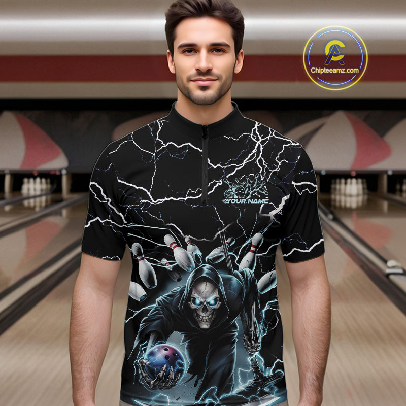 Custom Black And Blue Lightning Grim Reaper Bowling Men Quarter-Zip Shirt, Halloween Outfit IPHW9801