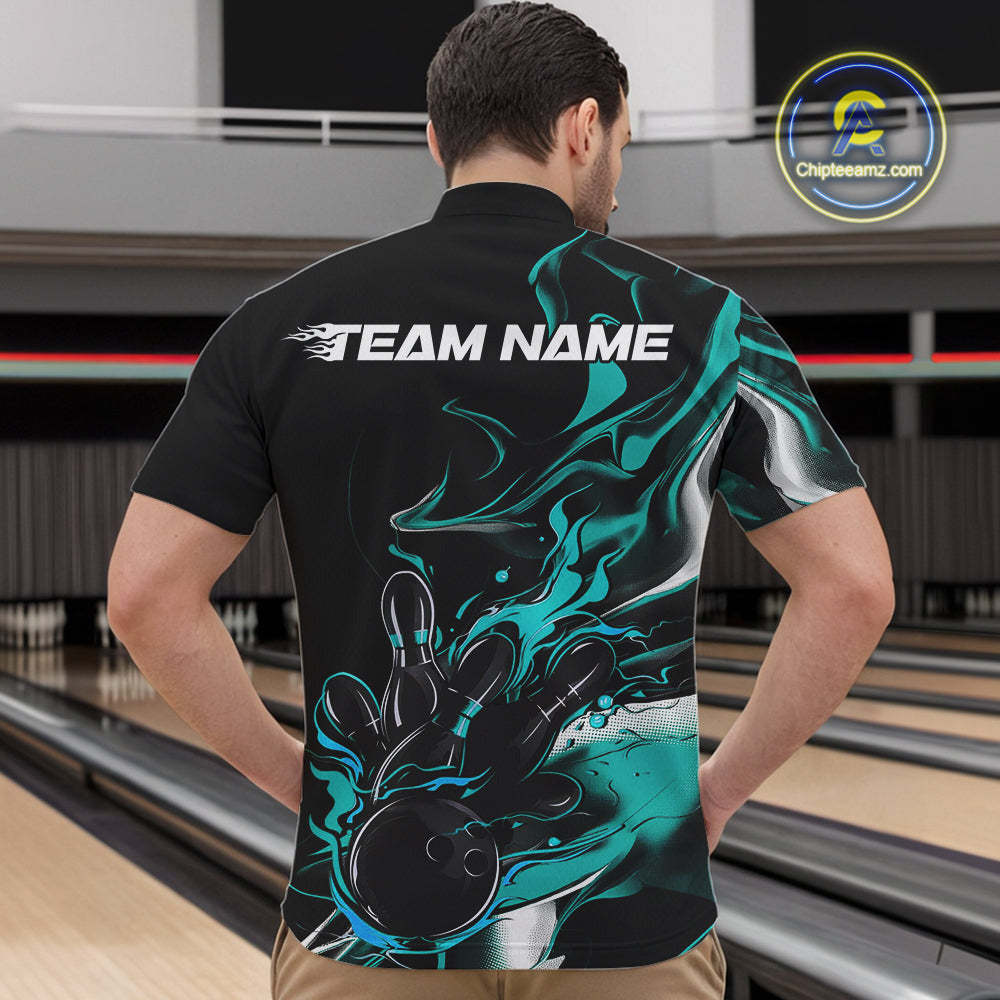 Custom Black And Turquoise Blue Camo Flame Bowling Team Men Quarter-Zip Shirts, Bowling Jerseys IPHW9878