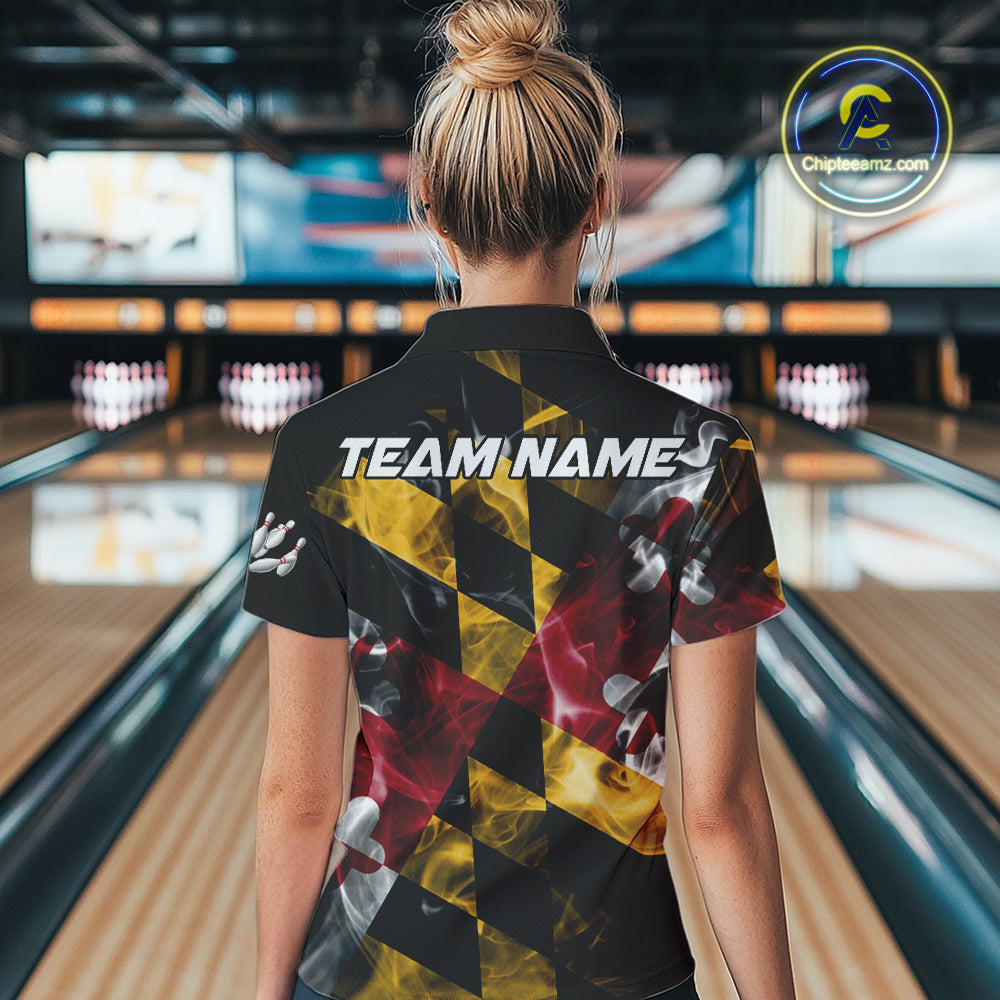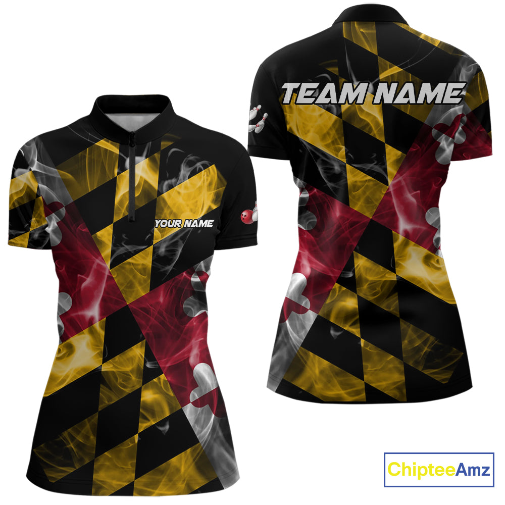 Smoke Maryland Flag Black Bowling Polo, 1/4 Zip shirt for Women Custom patriotic Team bowling jersey NQS10322