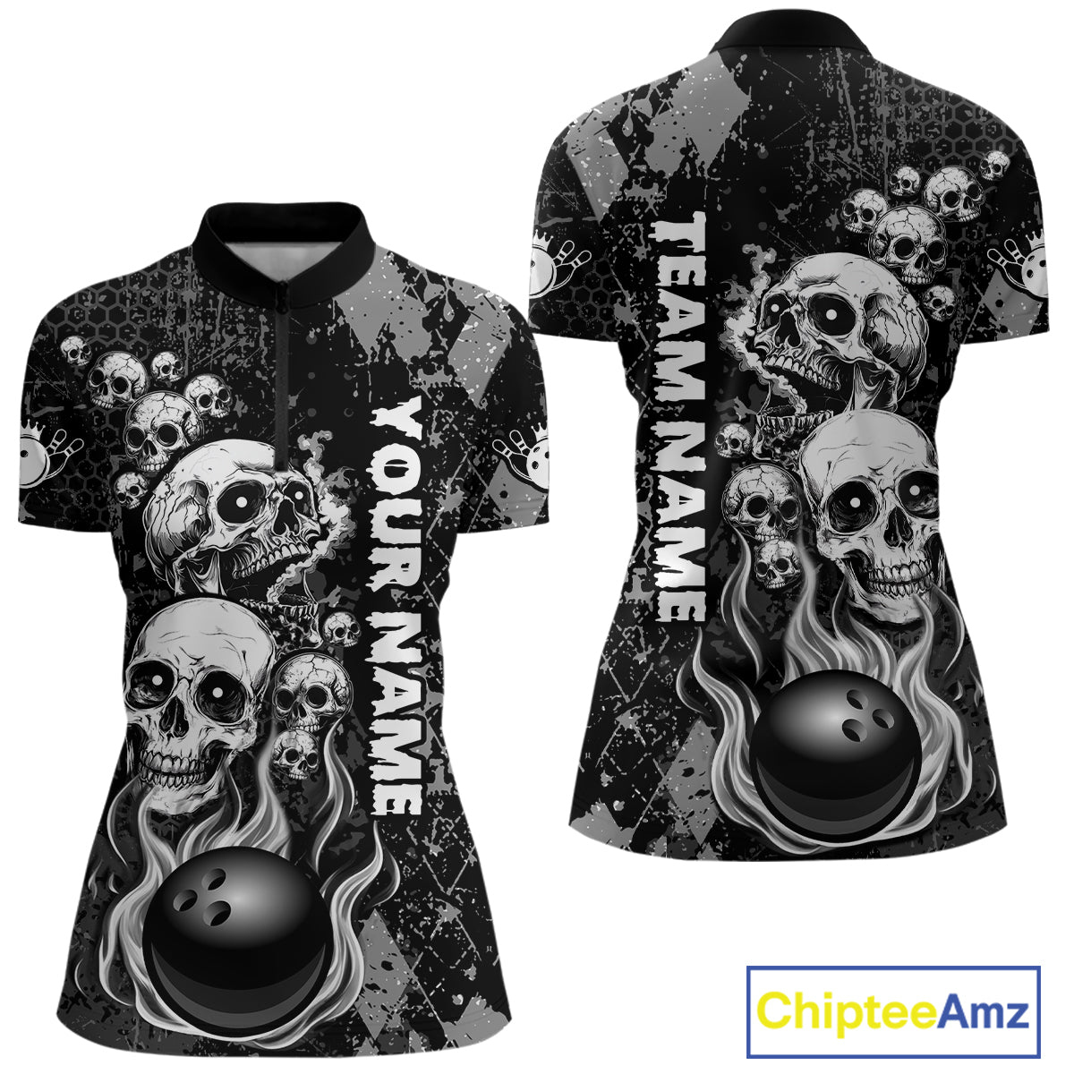 Black Grey Grunge Argyle Skull Bowling Shirt For Women Custom Bowling Team Jersey Polo & 1/4 Zip TDM4773