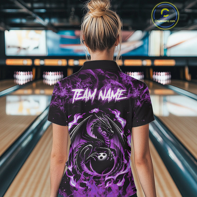 Black and Purple Flame Dragon bowling shirts for Women Custom Bowling Team Jersey, gift for Bowler NQS10247