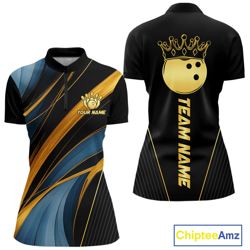 Blue & Gold Bowling ball Polo, Quarter Zip Shirts for Women Custom Bowling Outfit Team bowlers jersey NQS10032