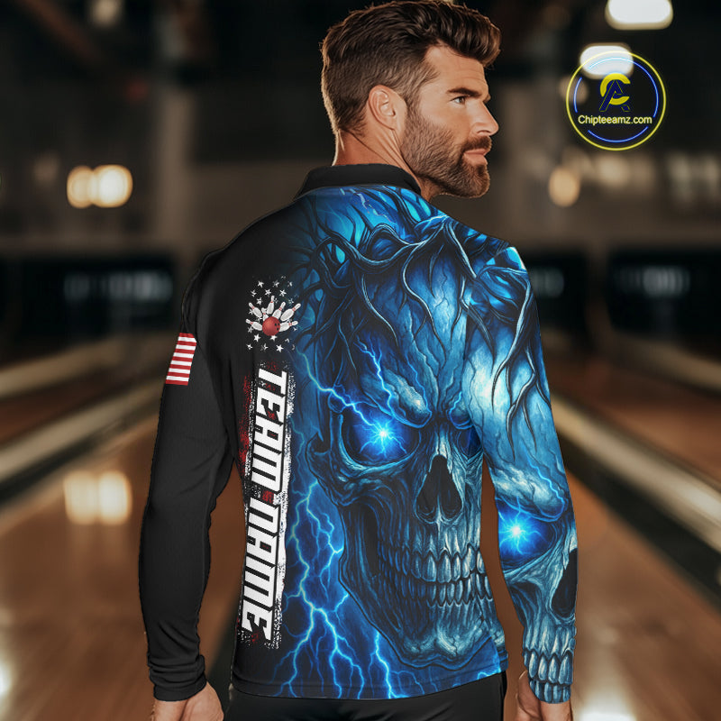 Custom Blue Lightning thunder Skull American Flag Patriotic Mens Bowling Shirts, Gift For Bowlers NQS10463
