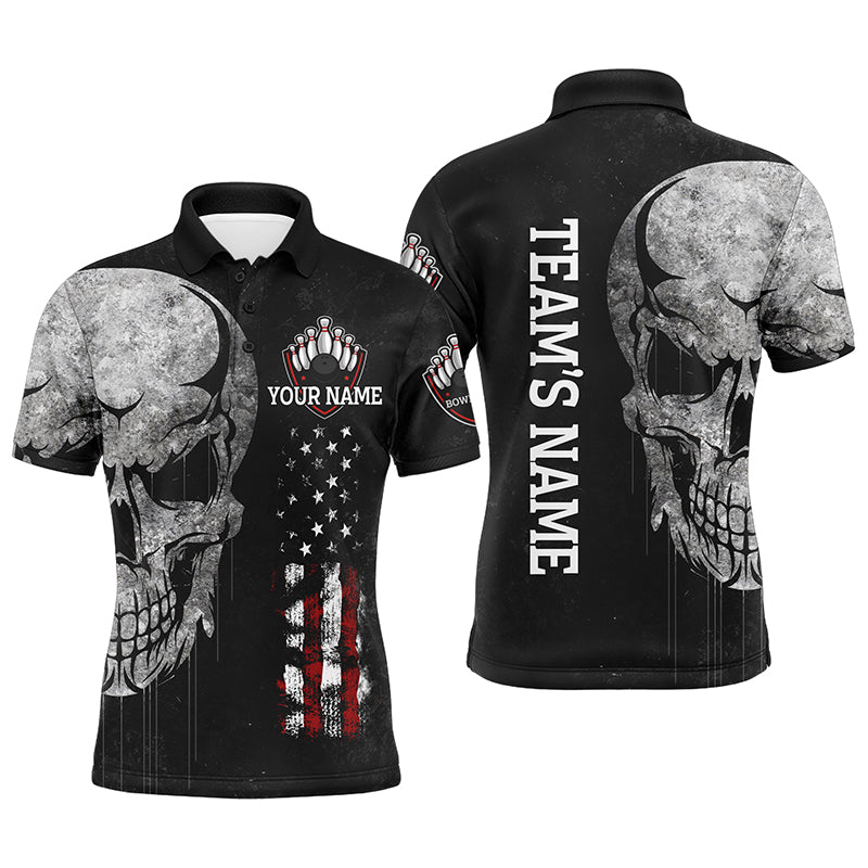 Men's Skull Polo Bowling Shirt, Patriotic Custom Name Men Bowlers Jersey American Flag NBP93