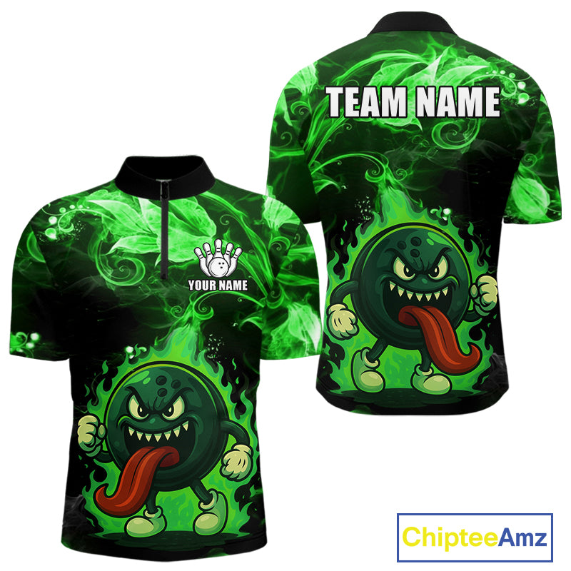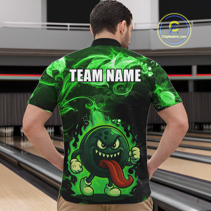 Personalized Funny Bowling Shirts for Men Green Flame Custom Bowling Team Outfit, Gift For Bowlers NQS10909