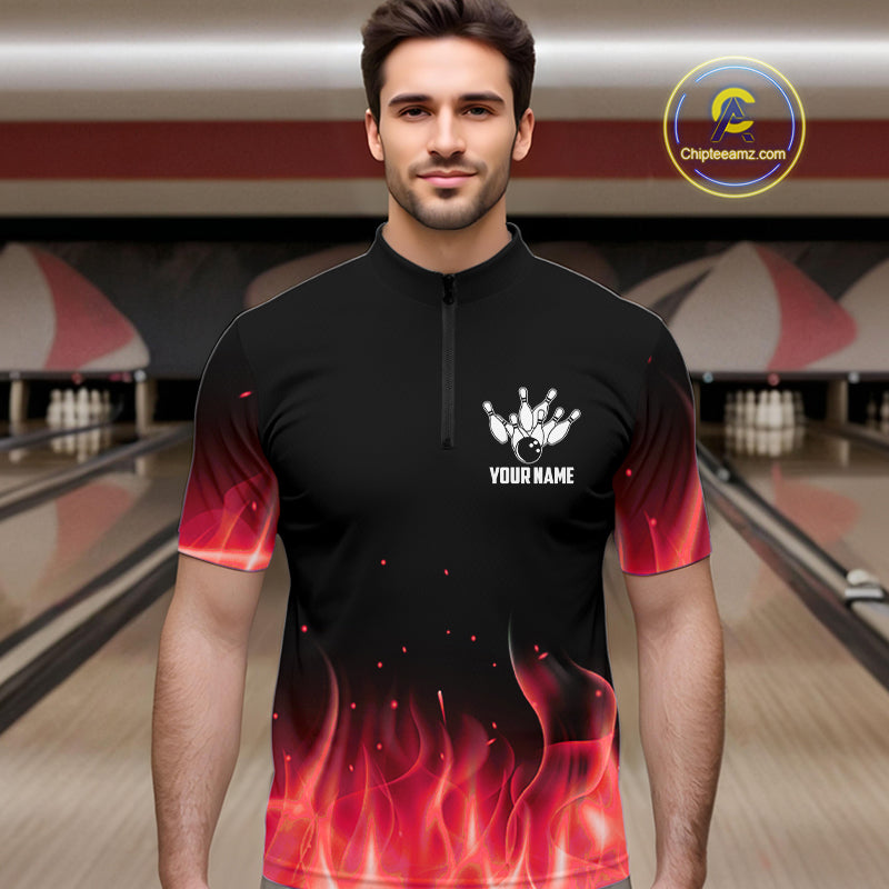 Personalized Mens Bowling Shirt Red flame Bowling Ball and Pins Team bowling jerseys for men Bowler NQS10473