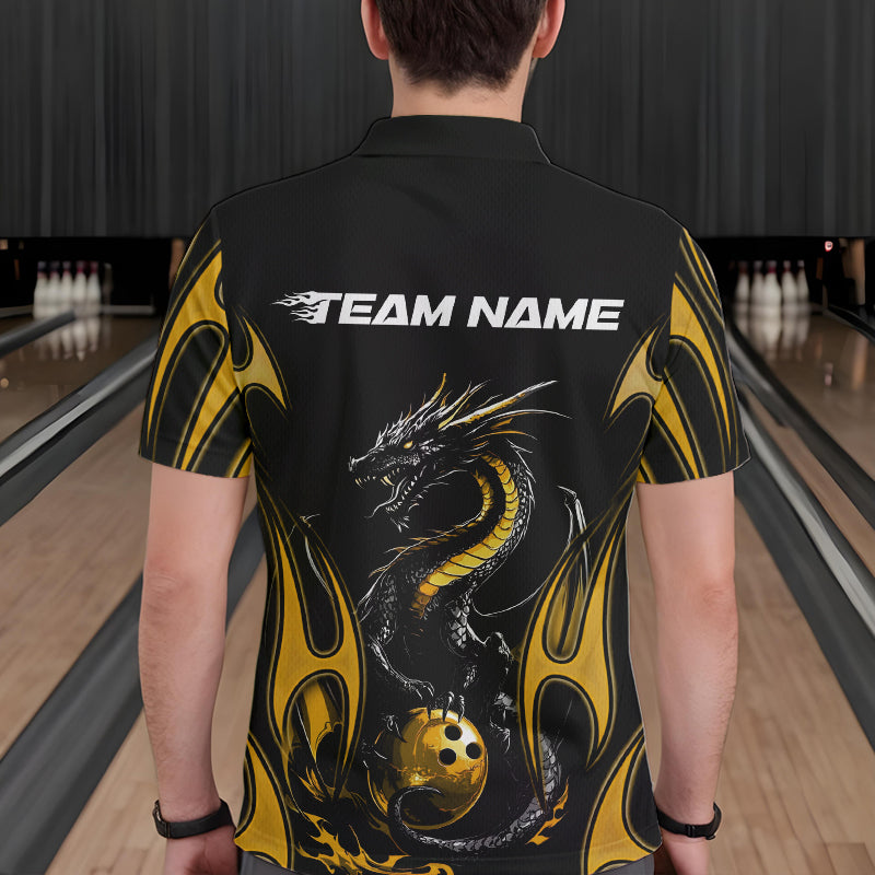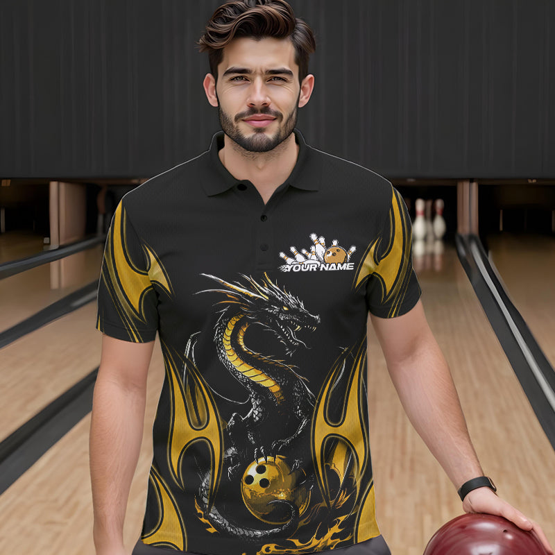 Custom Black And Gold Flame Dragon Bowling Tournament Polo Shirts For Men, Bowlers Outfits IPHW8658