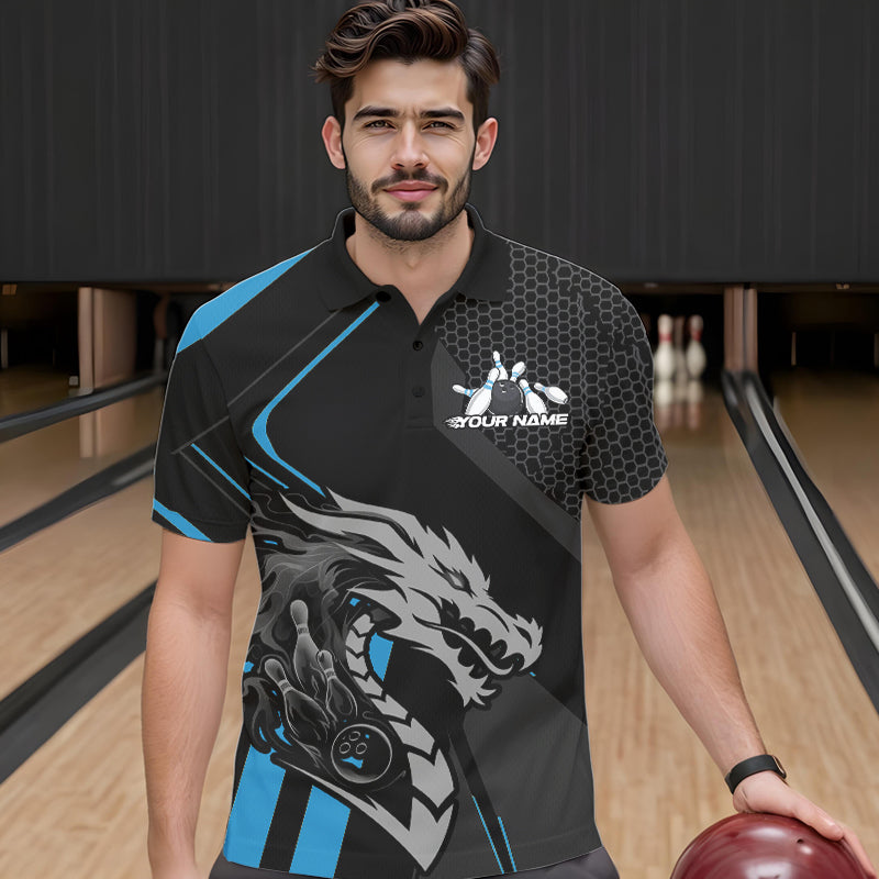 Custom Black And Blue Dragon Bowling Jerseys, Bowling Team Men Polo Shirts Bowlers Outfit IPHW8700