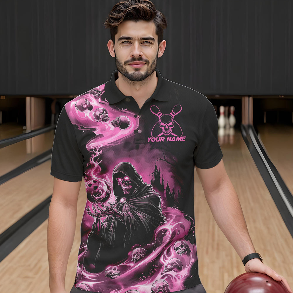 Black And Pink Grim Reaper Custom Halloween Bowling Team Men Polo Shirts, Bowlers Outfit IPHW8895