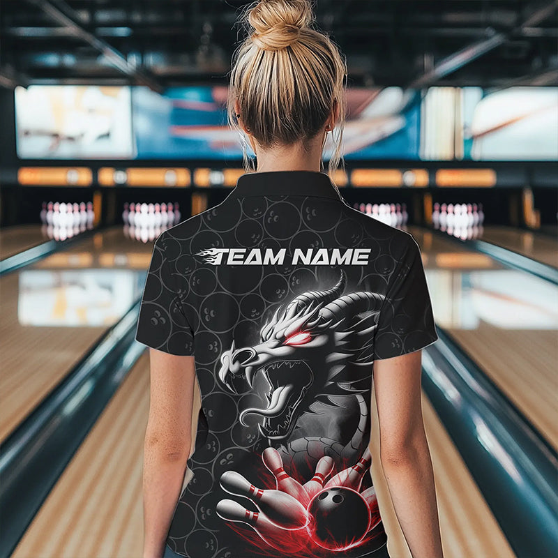 Custom Black And Red Dragon Bowling Women Polo Shirts, Bowling Pattern Dragon Bowler Outfit IPHW8916