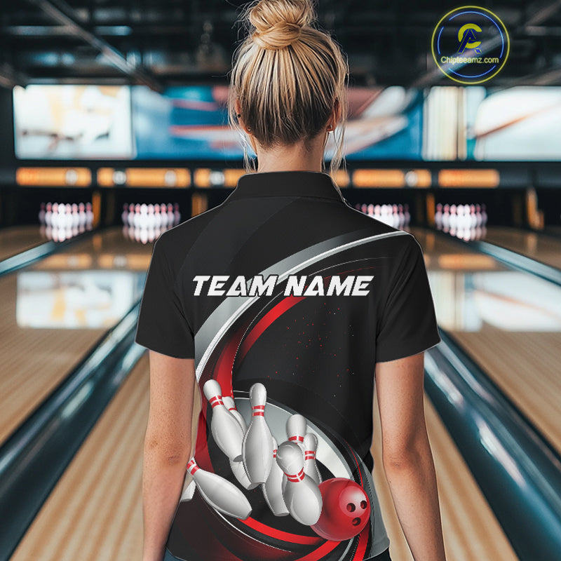 Custom Black And Red Bowling Team Jerseys, Bowler Uniform Bowling Polo Shirts For Women IPHW9276