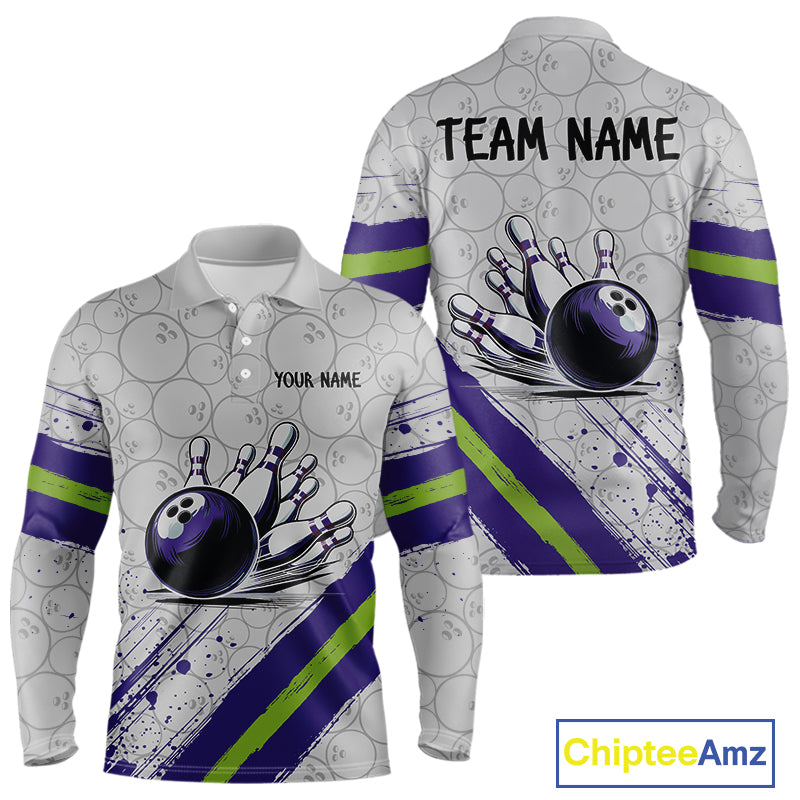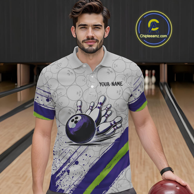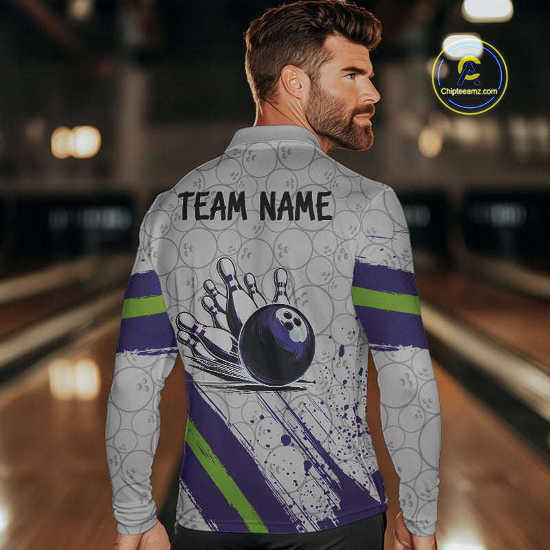 Purple and Green Bowling Camo Polo, 1/4 Zip Shirt for Men Custom Team bowling jersey gift for bowlers NQS10008