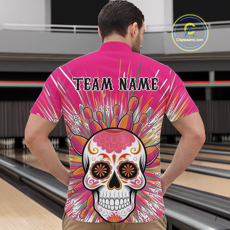 Custom Pink Sugar Skull Bowling Team Quarter-Zip Shirts For Men, Halloween Bowlers Outfit IPHW9254