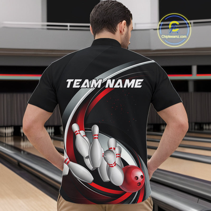 Custom Black And Red Bowling Team Jerseys, Bowler Uniform Bowling Quarter-Zip Shirts For Men IPHW9276