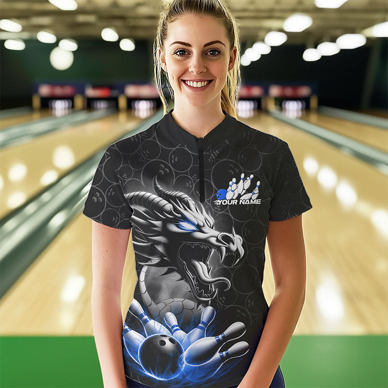 Custom Black And Blue Dragon Bowling Women Quarter-Zip Shirts, Dragon Bowler Outfit IPHW8918