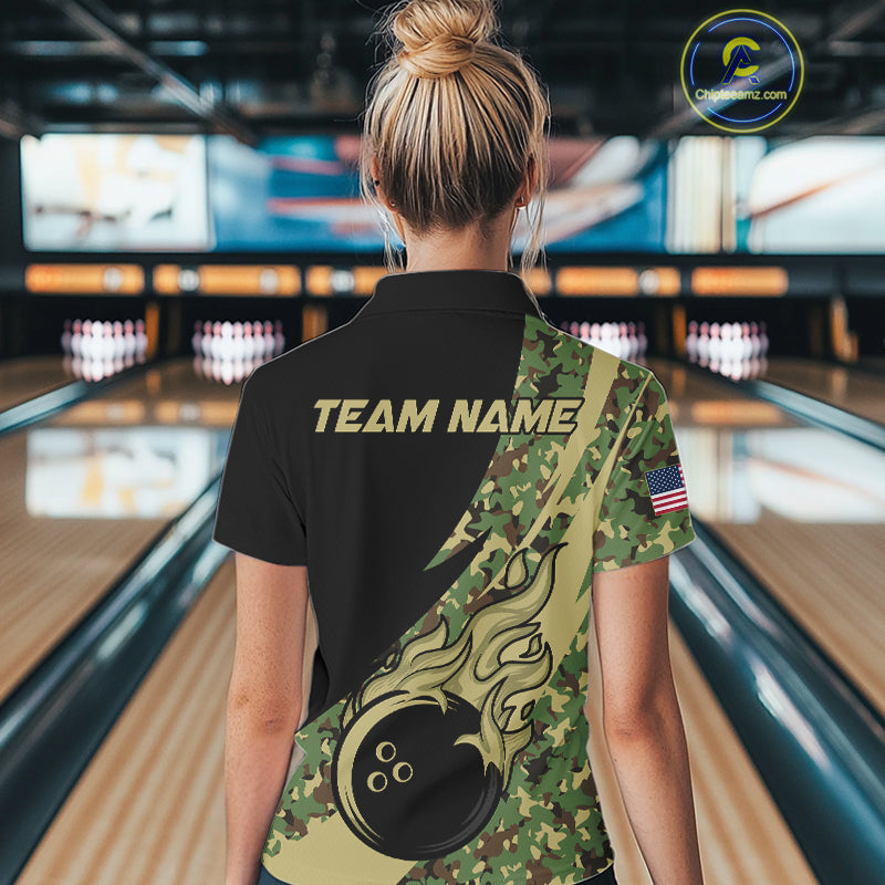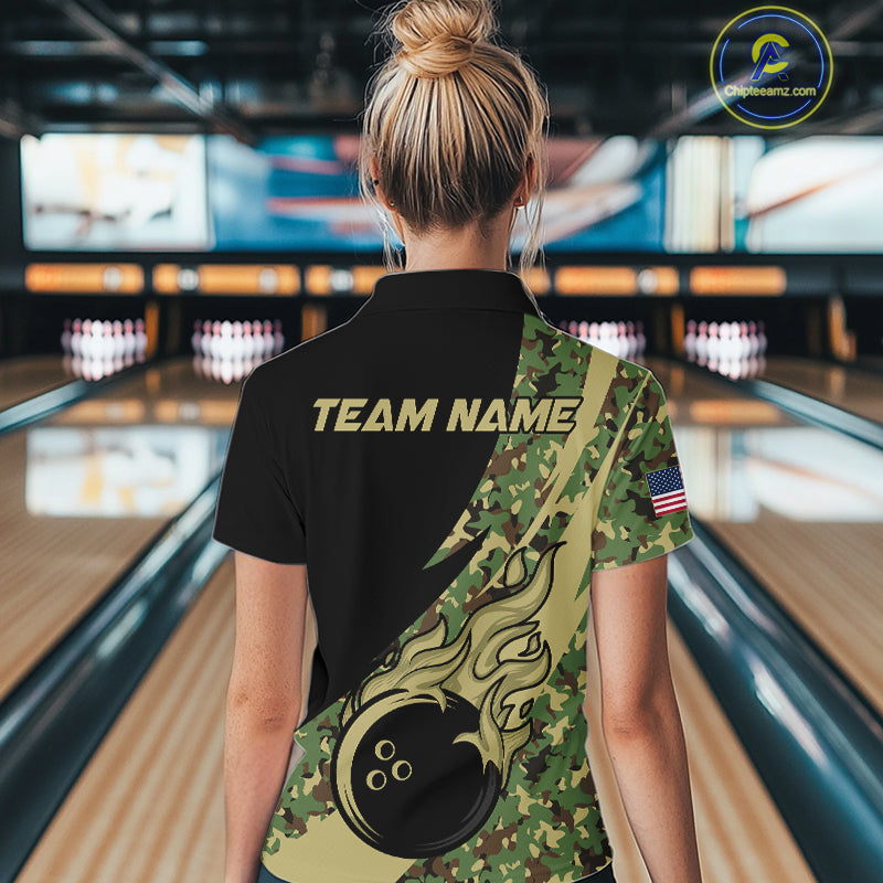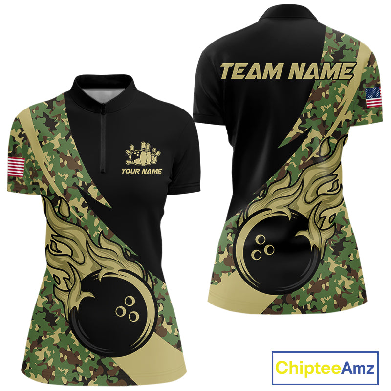 Women bowling polo, quarter zip shirts Custom green camo bowling team jerseys, gift for team Bowlers NQS10053