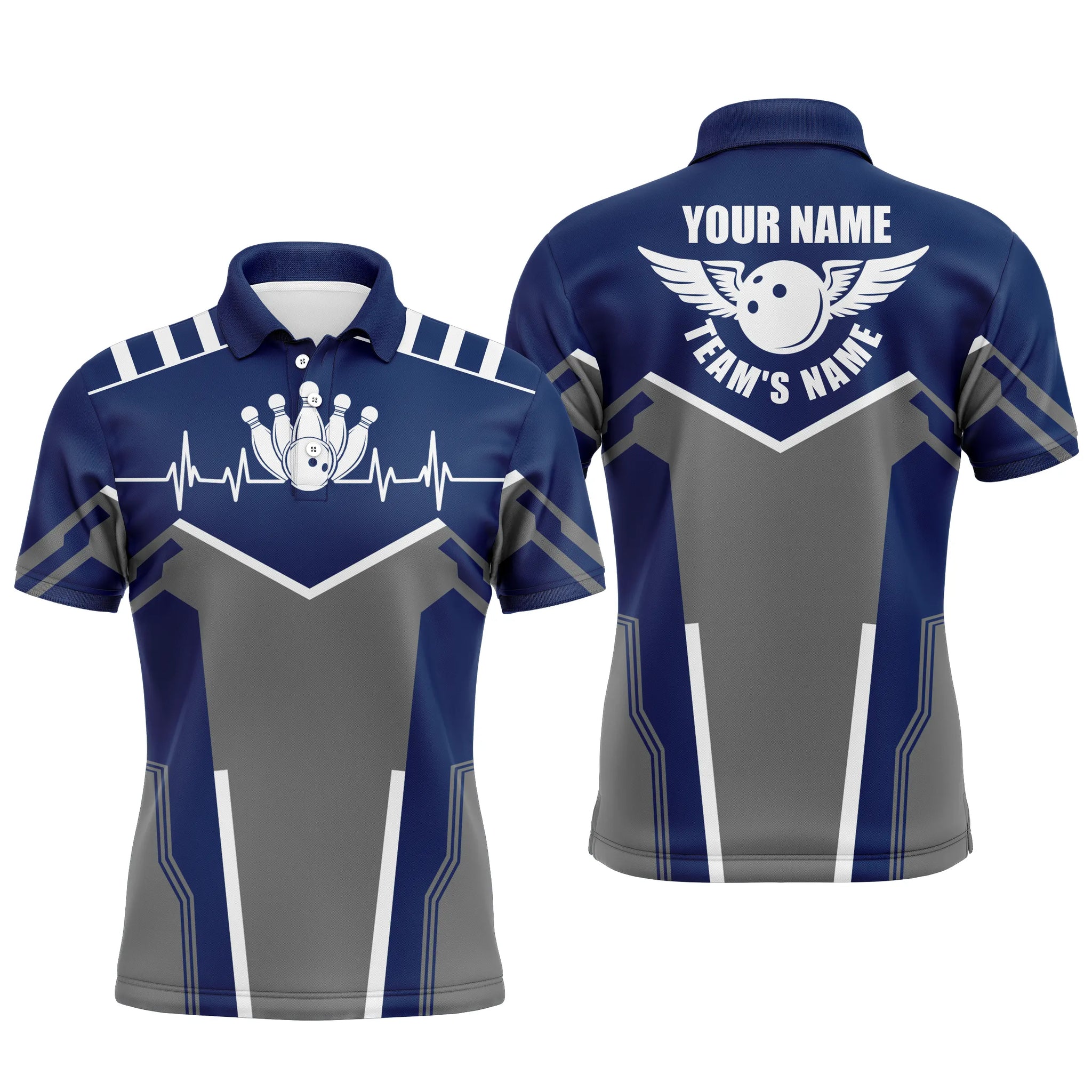 Bowling shirts for men custom name, team name Bowling Ball & Pins mens polo shirts | Navy Blue NQS4900