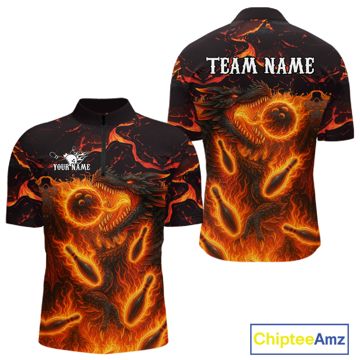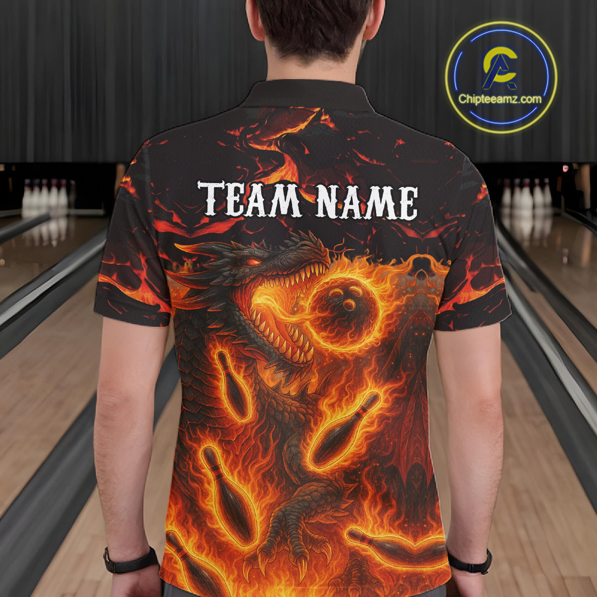 Black And Orange Flame Custom Dragon Bowling Shirts For Men, Dragon Team Bowling League Shirts NQS11071