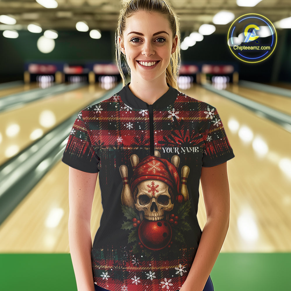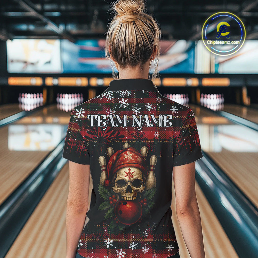 Black & Red Plaid Christmas pattern Skull Bowling Shirts For Women Custom Team Bowling outfit jersey NQS11057