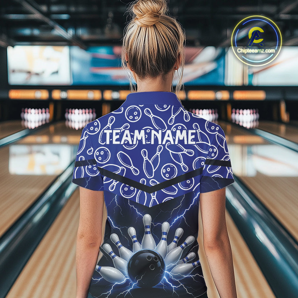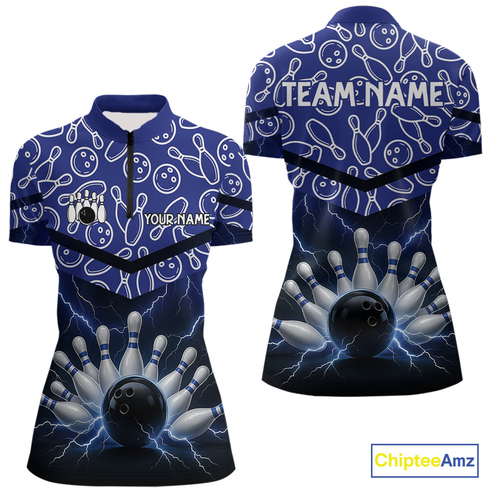 Blue camo Lightning Thunder Bowling Shirts For Women Custom Team 1/4 Zip, Polo style bowling shirts NQS10962