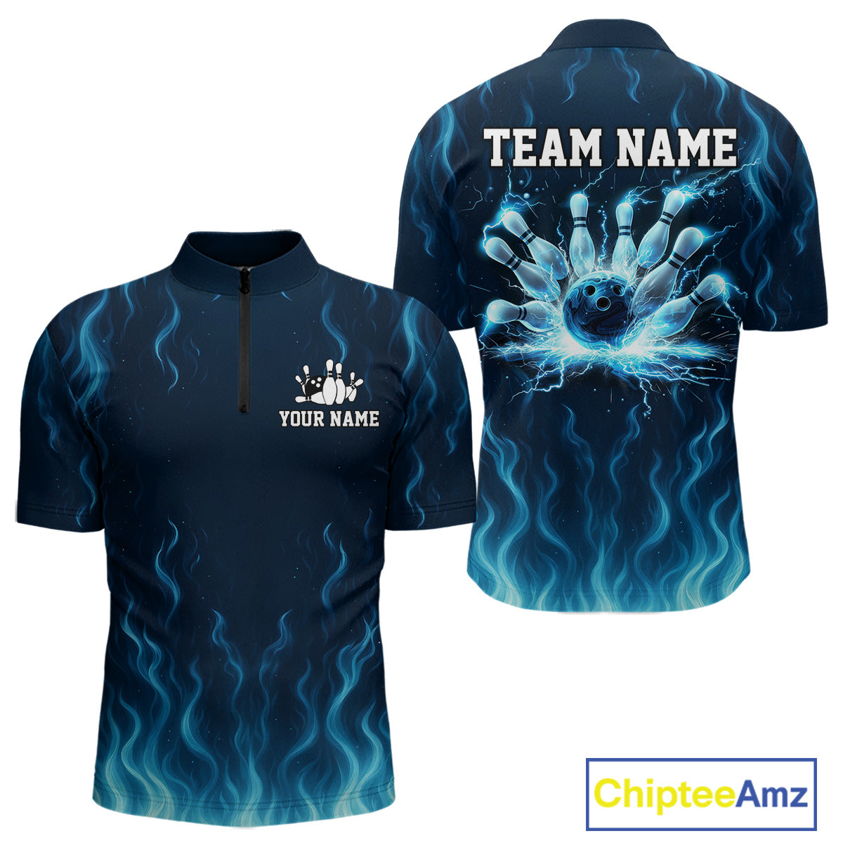 Blue flame lightning thunder Bowling polo, quarter zip shirts for men custom Bowling team jerseys NQS10387