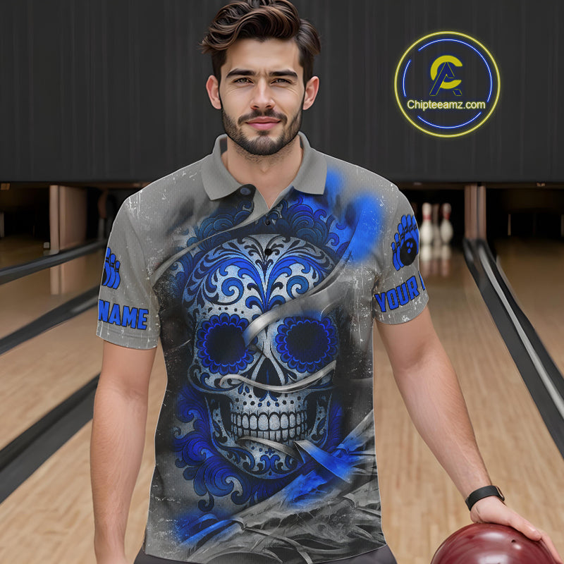 Blue Sugar Skull Tattoo Custom Mens Bowling Polo, Quarter Zip Shirts,Team Bowling Jerseys NQS10947