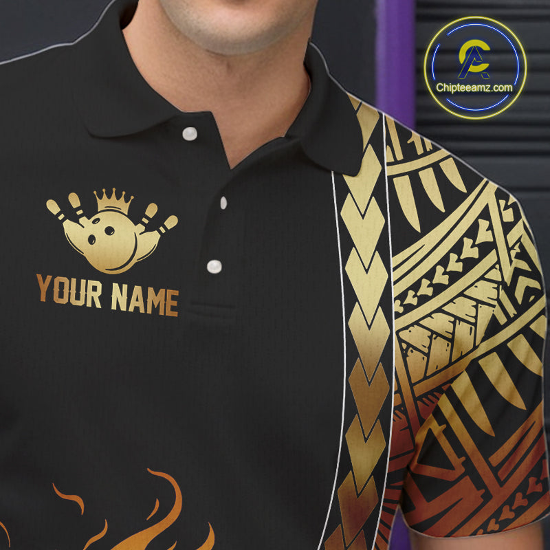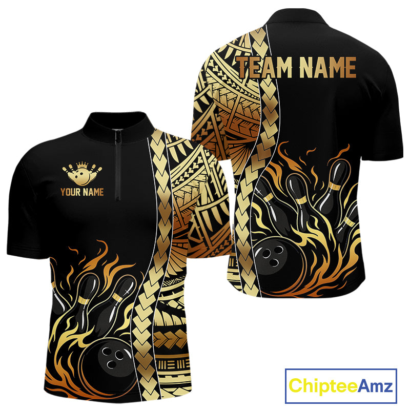 Custom Black And Gold Flame tribal pattern Bowling Team Polo, 1/4 Zip Shirts For Men, Bowling Jerseys NQS10093
