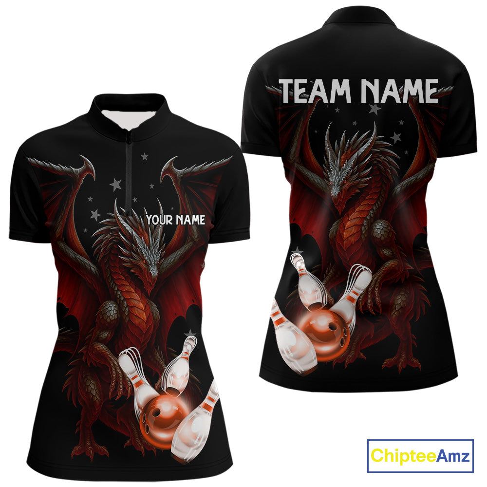 Custom Black And Red Dragon Bowling Shirts For Women, Team Bowling League Shirts NQS11090