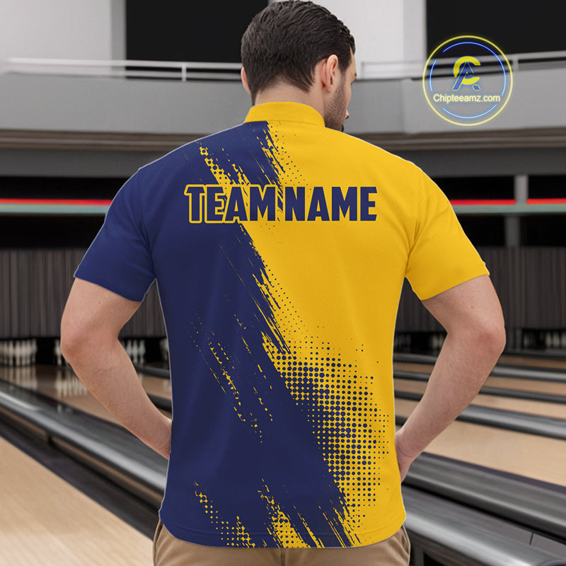 Custom Blue and Yellow Strike Bowling Shirts Men Polo, Quarter Zip Bowling Team Jersey Bowling League NQS11039